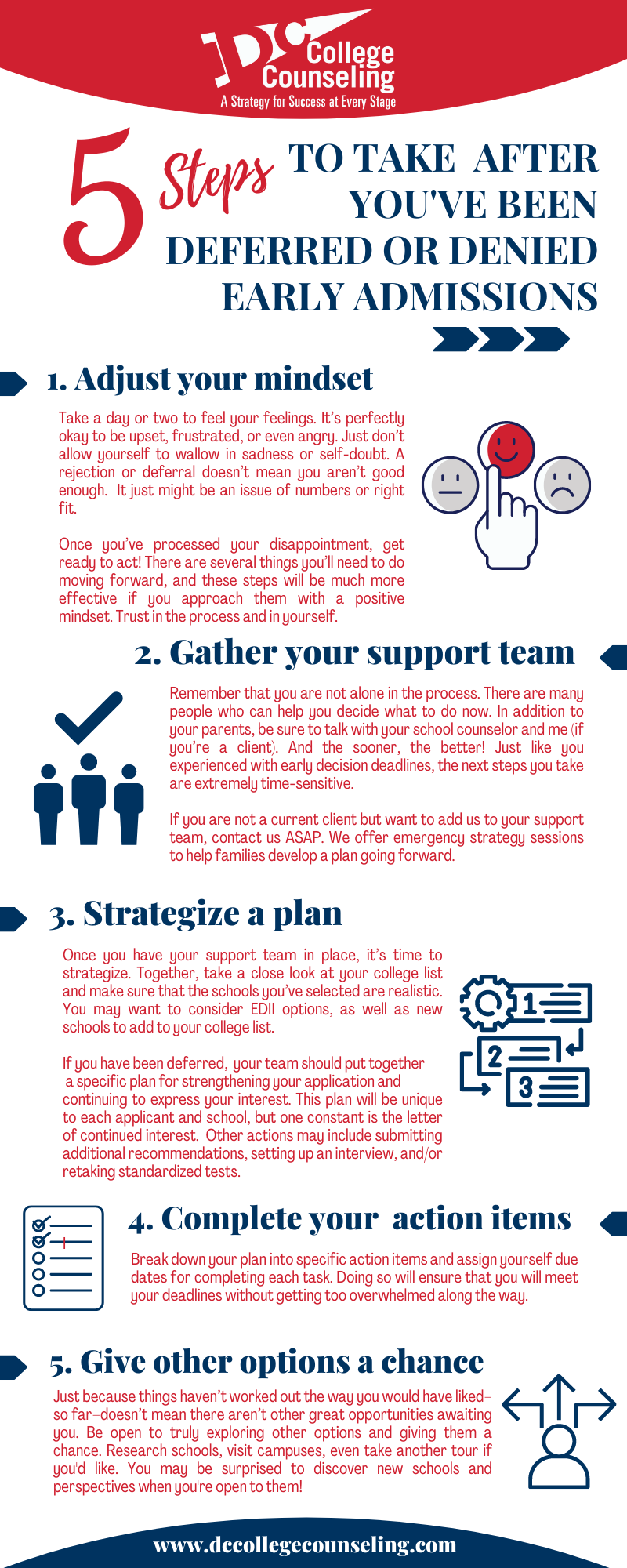 Process the news. It’s ok to allow yourself time to be disappointed (for a day or two). What you feel is real and needs to be expressed, but cannot take over your life. This sounds impossible, but don’t take it personally. Read our previous post: 5 Steps to Take After Being Deferred or Denied Early Admission.