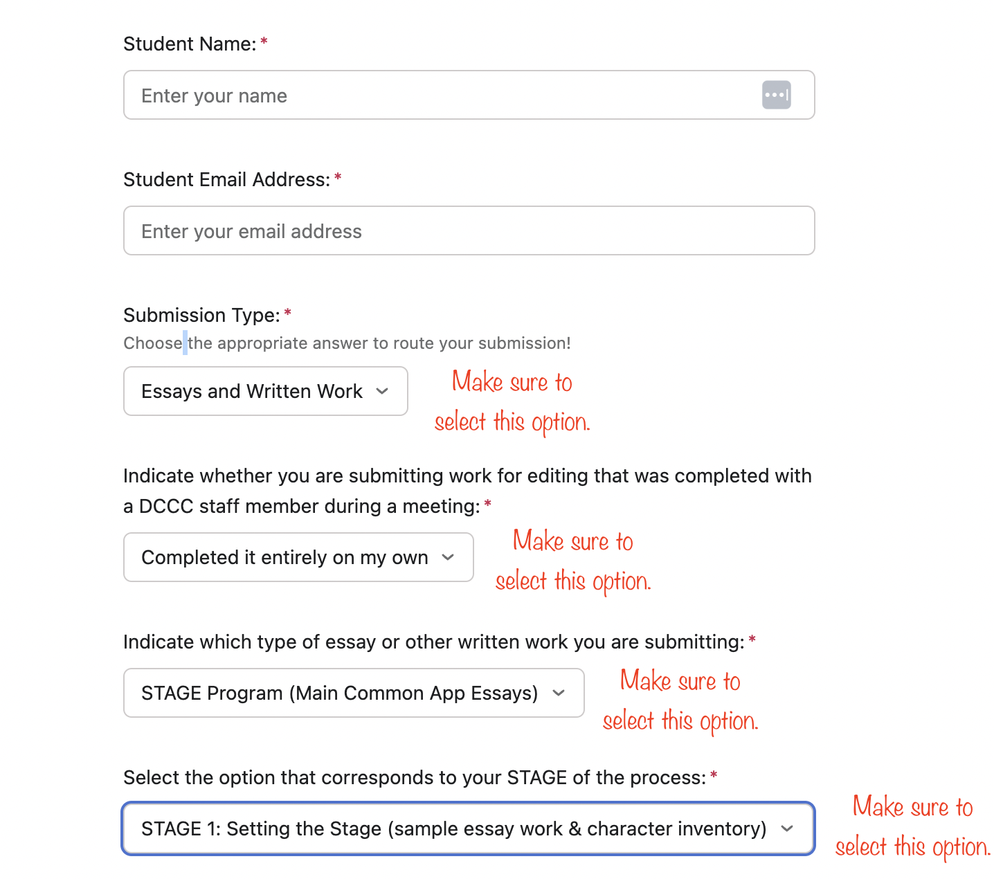 3. The submission form: Any time you are done with a STAGE assignment and want our team to take a look, you will submit your work using this form. We love Google folders and Docs, but there’s one problem: when you complete an assignment in a Google Doc, we have no way of knowing! As long as you select the right options on the form, it will automatically alert us that you’ve finished your work and it’s ready for us to review.